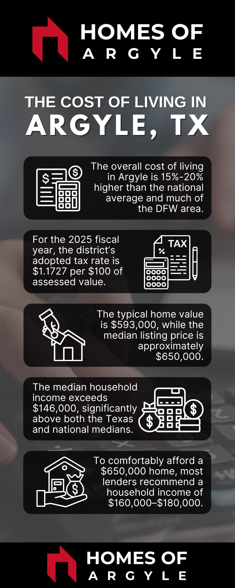 The overall cost of living in Argyle TX is estimated to be 15% to 20% higher than both the national average and much of the DFW area. While essentials like groceries and utilities remain moderate, the real driver of Argyle’s elevated index is its housing market.